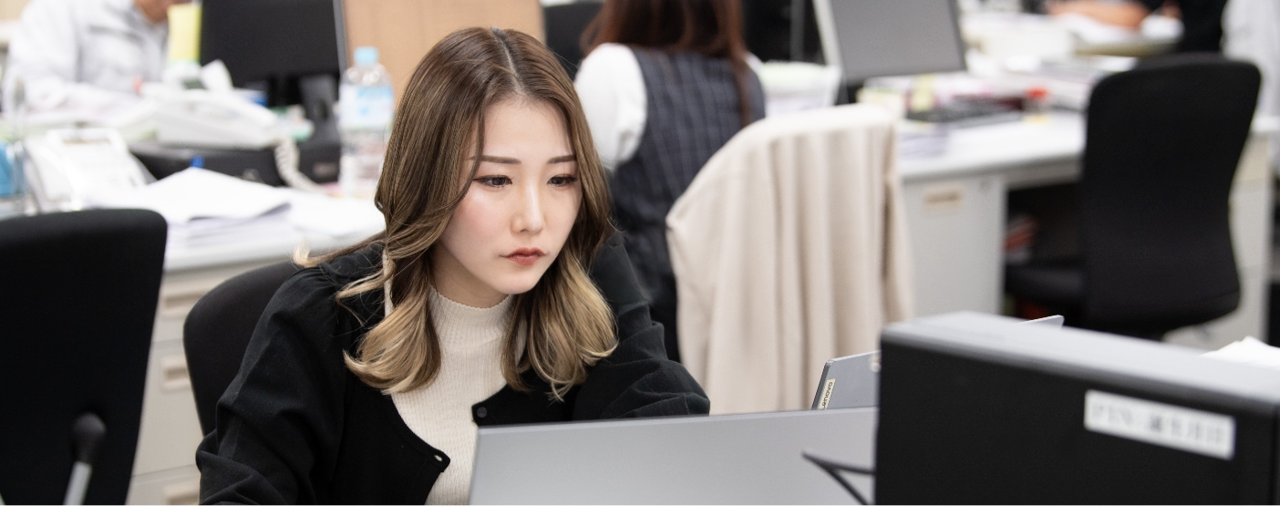 社員への給料計算や経費管理、売上計算などの事務作業を担当します。また、一般的な事務作業全般をこなし、社員が安心して働けるよう、会社の“裏側”を支える大切な役割です。